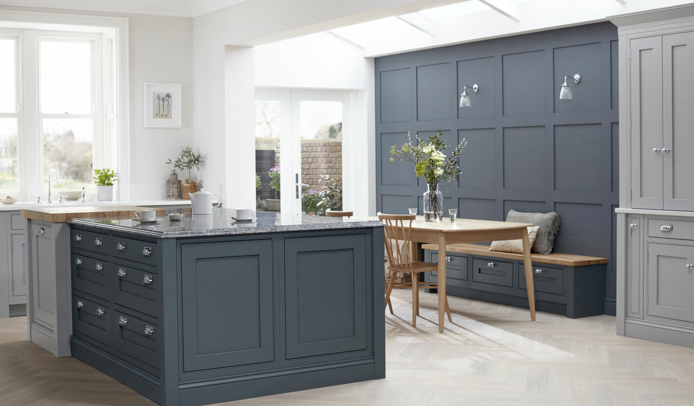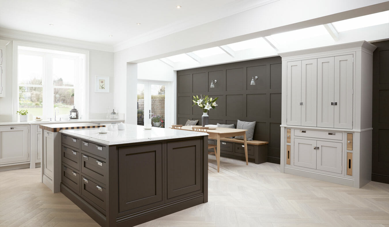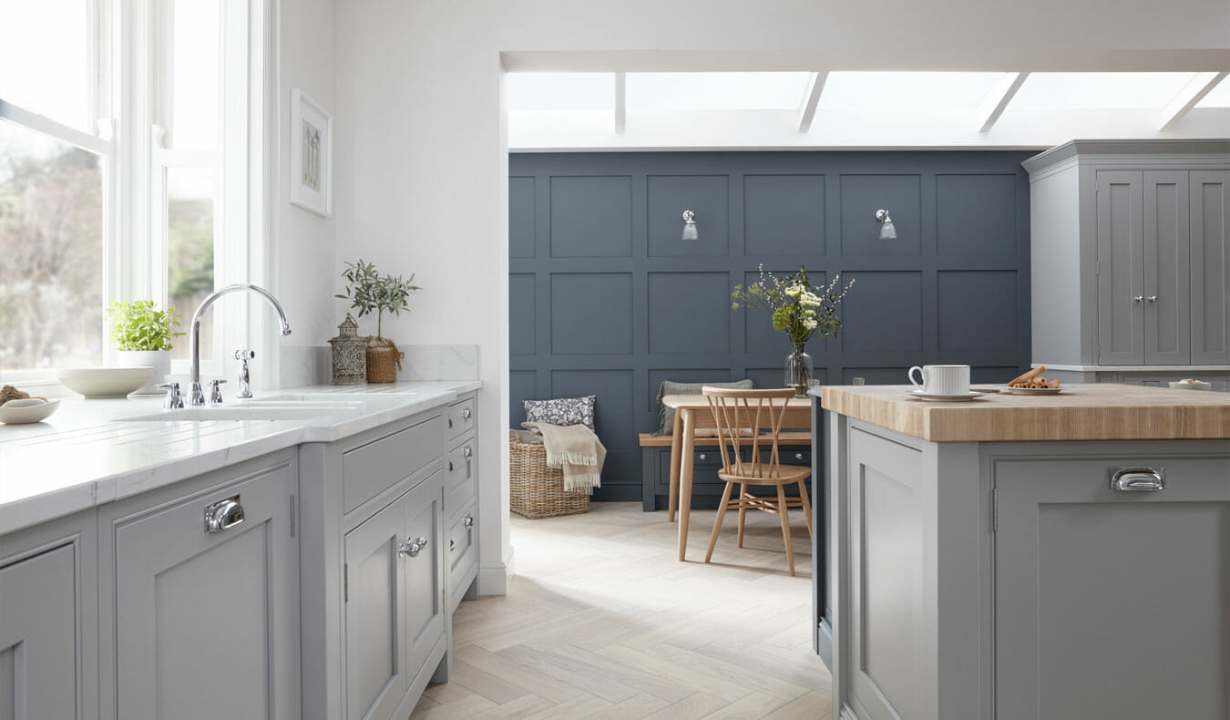 The overall aesthetic of this kitchen combines wall panelling, moulded cornice and a herringbone timber floor with a colour scheme of soft and deep greys, inspired by a 19th Century colour palette. Alternatively, three very different natural shades of Truffle, Cashmere and Porcelain work beautifully together to create an endearing, earthy palette.