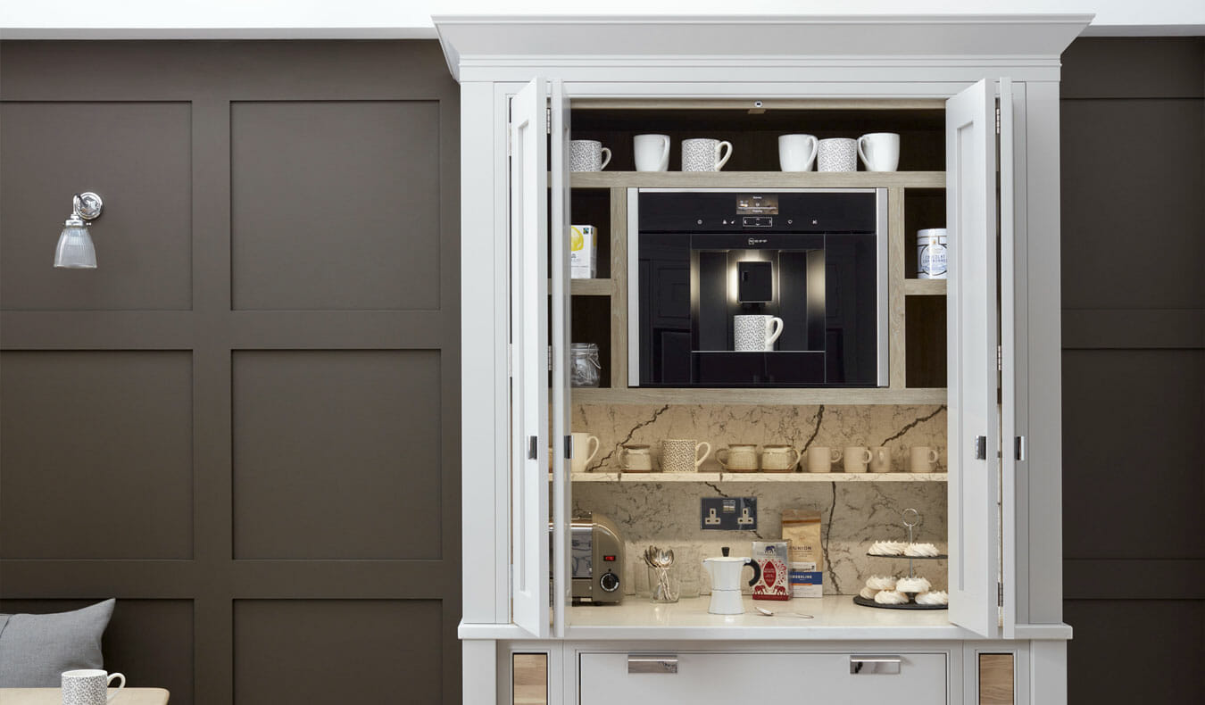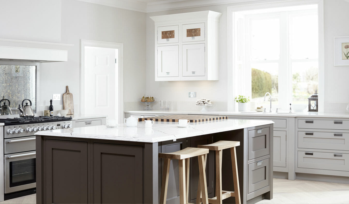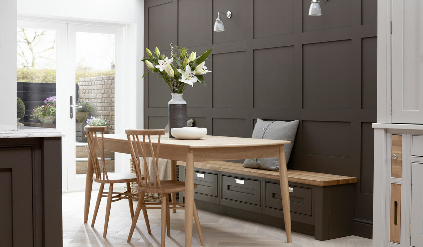 The overall aesthetic of this kitchen combines wall panelling, moulded cornice and a herringbone timber floor with a colour scheme of soft and deep greys, inspired by a 19th Century colour palette. Alternatively, three very different natural shades of Truffle, Cashmere and Porcelain work beautifully together to create an endearing, earthy palette.
